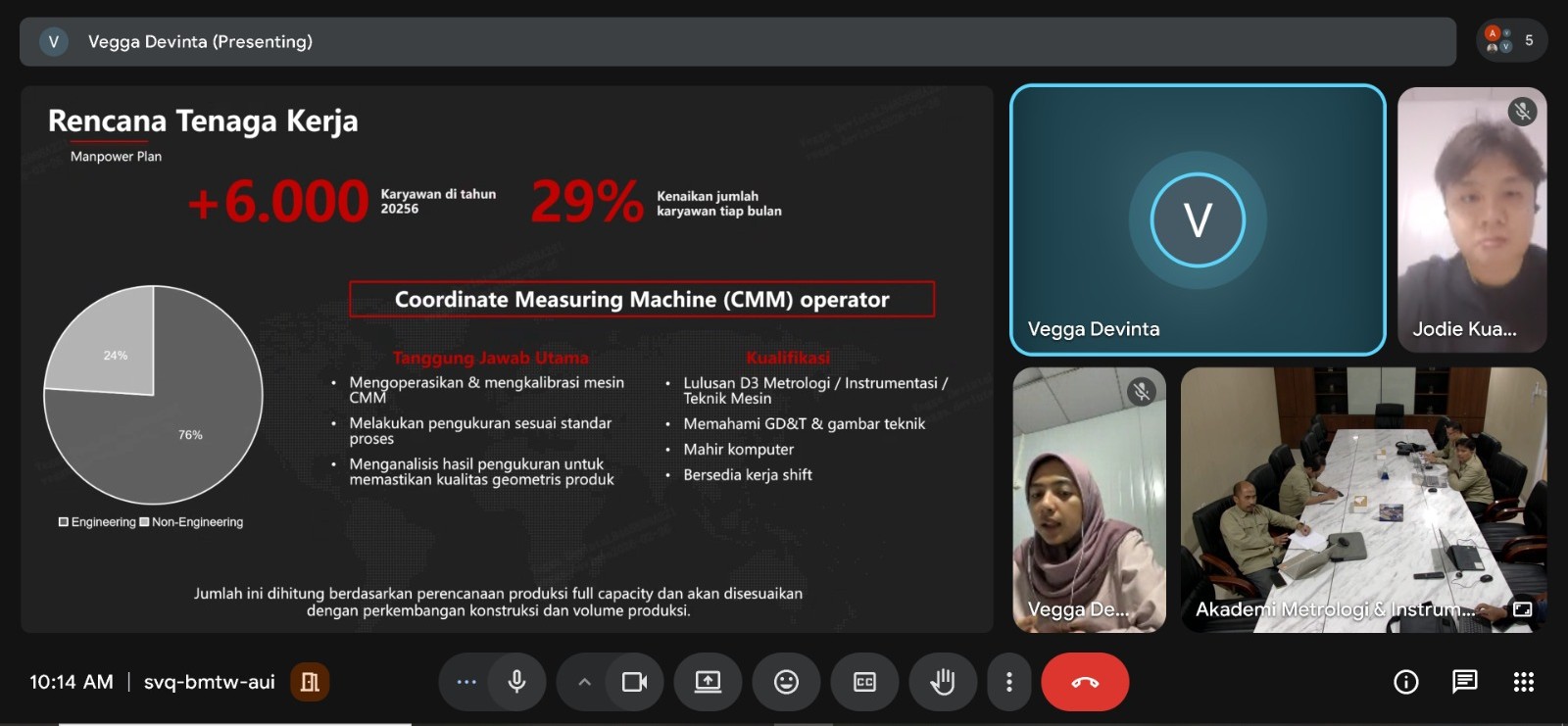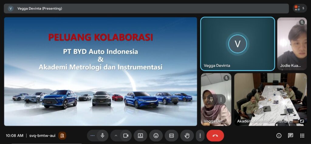 Sumedang, 26 Februari 2026 — Akademi Metrologi dan Instrumentasi (Akmet) melaksanakan pertemuan daring bersama perwakilan dari PT. BYD Auto Indonesia dalam rangka membahas peluang kerja sama strategis antara pendidikan vokasi dan industri. Pertemuan dilaksanakan melalui Google Meet, dengan jajaran pimpinan Akmet mengikuti kegiatan dari Ruang Rapat Direktur.